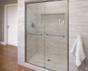 Serenity Series Sliding Door System has an entirely different look from traditional sliding shower door systems. The use of minimal hardware provides a frameless look that gives the enclosure an almost floating appearance. Specially designed roller bearings allow for quiet, easy opening and closing of the door. This unique roller system operates above the header bar that spans the top of the enclosure.